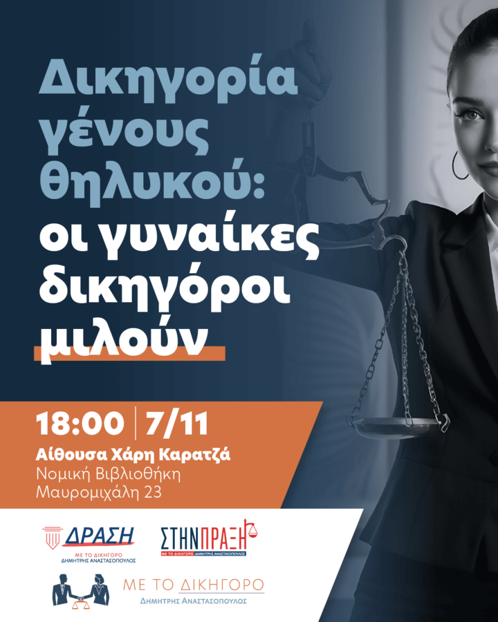 Σε μία περίοδο όπου η δικηγορία, παρά την πρόοδο και παρά το γεγονός ότι αριθμητικά οι γυναίκες δικηγόροι υπερτερούν πλέον κατά πολύ των ανδρών, εξακολουθούν να υφίστανται ανισότητες και στερεοτυπικές πρακτικές, η εκδήλωση «Δικηγορία γένους θηλυκού» δίνει τον λόγο σε γυναίκες του επαγγέλματος, αναδεικνύοντας τις πραγματικές συνθήκες και τις αναγκαίες θεσμικές αλλαγές.
